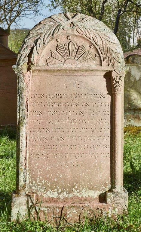 Stele mit zwei schlanken Säulen und einem floralen Kapitell rahmen das Schriftfeld. Im mit Palmblätter verzierten Rundbogenabschluß Sonne mit Strahlenkranz und ehemals 7 Sternen.