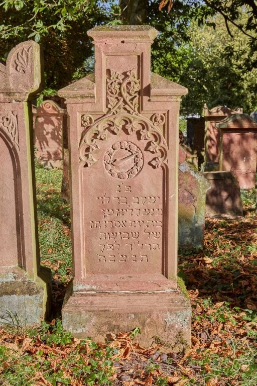 Ein neogotischer Stein mit Treppengiebel und Rankenwerk. In der Mitte das Schofar, das am Rosch Ha-Schanah, dem Neujahrstag geblasen wird, zum Lobe des Herrn (Ps 159,3) und zum großen Weltgericht, wenn der Messias kommt und sein Reich aufrichtet (Jes 27,13). Das Symbol macht Jakob Drum als Schofarbläser der Gemeinde deutlich.