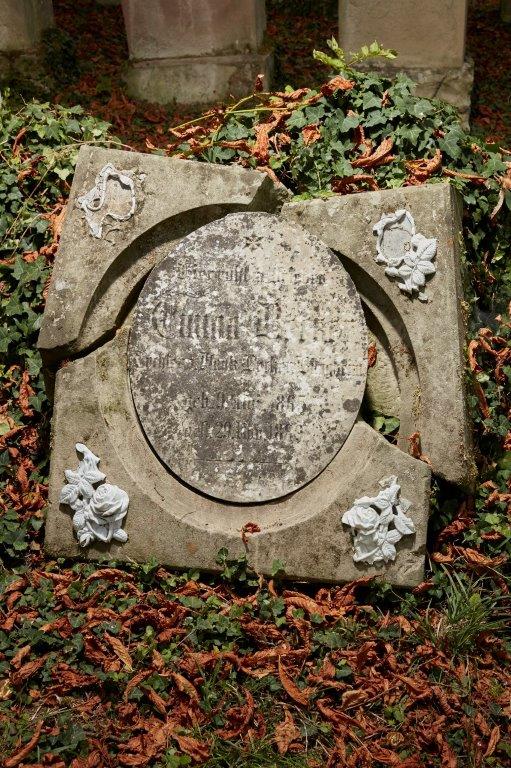 Die 4 Ecken sind mit weißen Marmorrosen bestückt. Der Sandsteinrahmen ist zerbrochen.