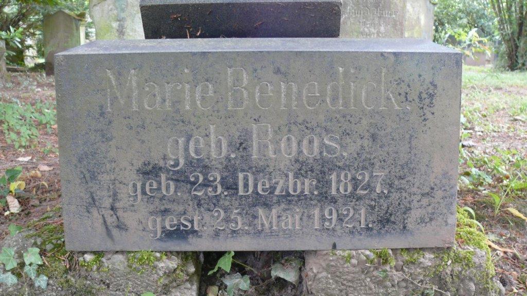 Im Sockel ist die Inschrift für Marie Roos zu lesen. Der obeliskartige Aufsatz liegt mit der oberen Kante auf dem Sockel.