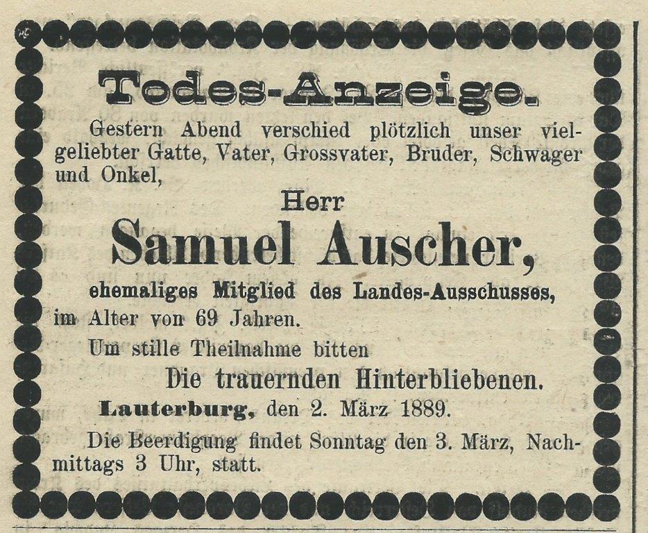 Samuel Auscher aus Lauterbourg, Sohn der Eheleute Leon Auscher und Sara geb. Roos, heiratete dort am 16. Mai 1843 die aus Ingenheim stammende Julia Roos. Samuel war Gemeindepräsident von Lauterbourg.