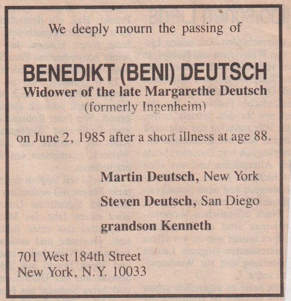 Benjamin Deutsch, genannt Benedikt, war verheiratet mit Margarethe Deutsch geb. Zivi. Ihre zwei Kinder waren Martin, geboren um 1932, und Stefan, geboren am 16. Juli 1934 in Ingenheim.