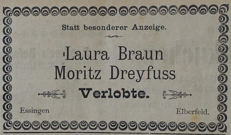Moritz Dreyfuß war mit Laura geb.Braun aus Essingen verheiratet. Sie wohnten später in Eberfeld, wo die beiden Kinder Heinrich Dreyfuß (1902 - 1980) und Paul Dreyfuß (1906 - 1977) zur Welt kamen. Später emigrierte das Paar nach Forest, rue Zodiaque 23 (Brüssel), wo Moritz im Alter von 70 Jahren verstorben ist.