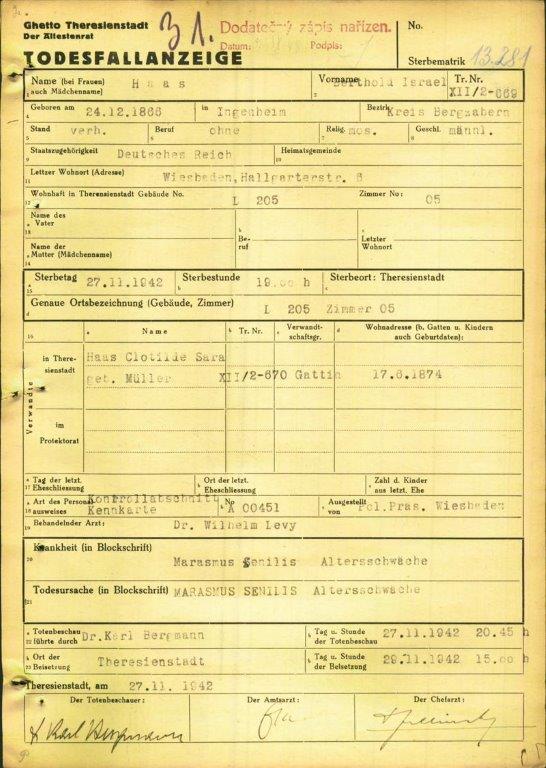 Wohnung 1942: Wiesbaden Hallgartenstr. 6/II. Mit Transport Nr. XII/2 – 669 ins Ghetto Theresienstadt am 01. September 1942. 27. November 1942 gestorben in Theresienstadt (Liste der in Theresienstadt verstorbenen Juden von 1942-44 aufgestellt von der jüdischen Gemeinde Frankfurt/M)