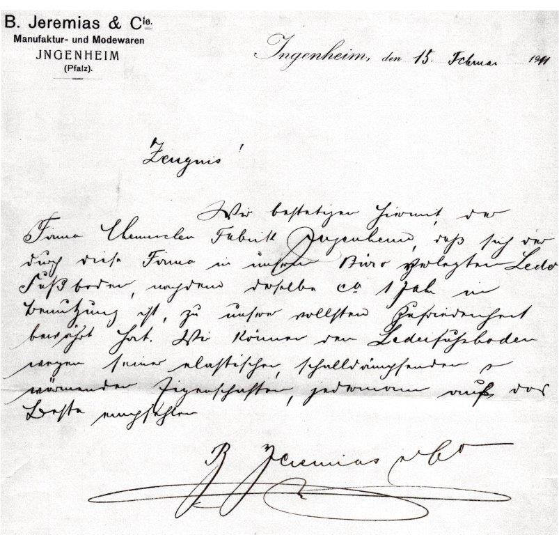 Der Kaufmann Benjamin Jeremias, der in Ingenheim ein Manufactur- und Modewarengerschäft betrieb, heiratete am 03. September 1890 in Landau / Pfalz Bertha geb. Haas. 1937 wohnten sie - zusammen mit Sohn Dr. Paul Jeremias in Landau, Ostbahnstr. 47. 1939 waren sie wohnhaft in Heidelberg, Leopoldstr. 41. Dort ist Benjamin am 09. November 1939 im Alter von 78 Jahren verstorben. Er wurde auf dem Bergfriedhof in Heidelberg bestattet.