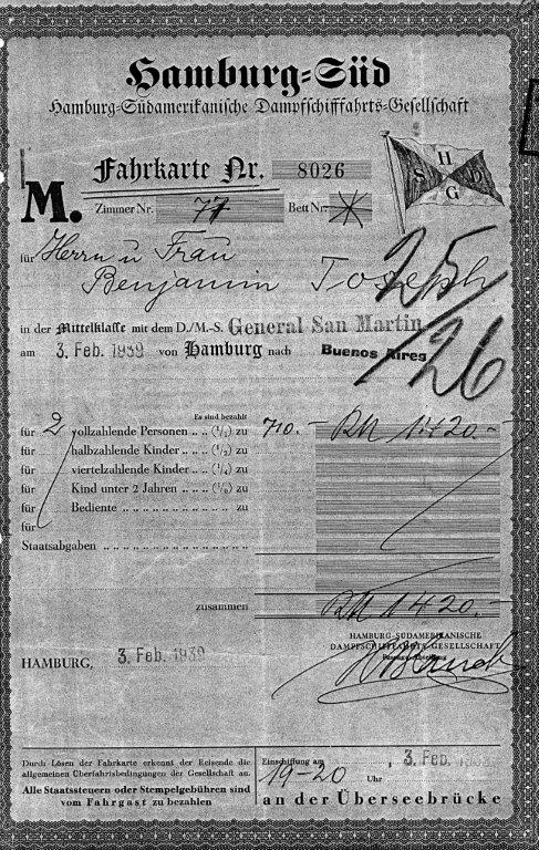 Als die Zustände unhaltbar wurden, übersiedelten Benjamin und seine Frau Caroline am 03. Februar 1939 mit dem Schiff "General San Martin" der Hamburg-Südamerikanischen Dampfschifffahrts-Gesellschaft in der Mittelklasse für je 710 RM von Hamburg aus nach Buenos Aires. Die Transportkosten des Lifts (Container) durch die Firma Scheer betrug 1.700 RM.