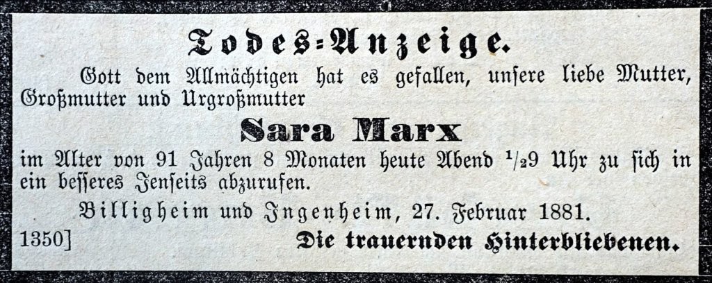 Sara Bach, früher Sara Abraham, Tochter der Eheleute Joseph Bach und Hanna Altschul, heiratete am 21. Dezember 1815 den Metzger Lazarus Marx. Sie starb im Alter von 91 Jahren. Sie wurde auf dem jüdischen Friedhof in Ingenheim beerdigt. Grabstelle: 3 04 05 (Feld 3 Reihe 4 Grab 5).