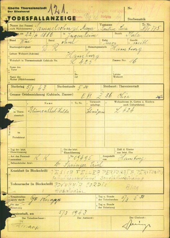 Wohnung: Hamburg, Frickestraße 24. Samuelsonova v. Mayer Pauline VI/1 – 775 (Theresienstadt). Transportliste Gestapo: Hamburg 14 (BGB 15). Juli 1942 Evakuierung der Juden aus Hamburg – Eltern: Jonas Mayer und Carolina Marx. Geschwister: Samuel - Frieda Marx (geb. 23. Mai 1878) - Siegfried (geb. 02. Juli 1877) - Otto (geb. 16. Februar 1883) - Simon (geb. 30. März 1884). Am 11. November 1902 verheiratet mit Ludwig Samuelsohn (geb. 18. April 1872 in Christburg/Marienwerder, gest. 02. Oktobeer 1941 in Hamburg).