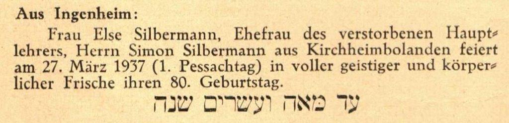 Elisa Nathan war die Tochter des Volksschullehrers Jakob Nathan und Stefanie Baum. Sie war verheiratet mit dem Hauptlehrer Simon Silbermann. Elisa starb im Alter von 81 Jahren im Haus ihres Schwiegersohns Max Marx in Ingenheim.